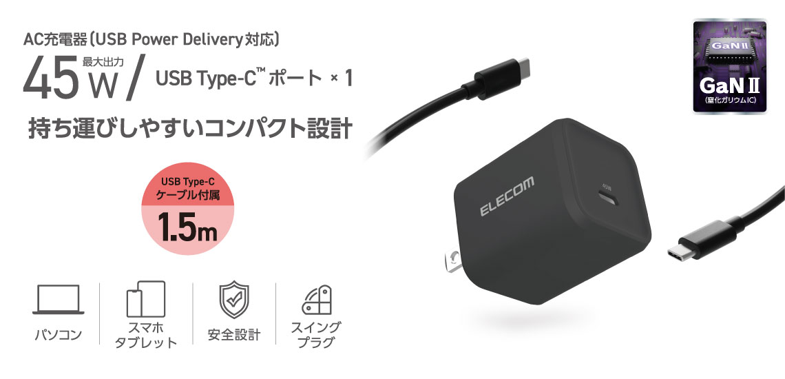 スマートフォンやタブレット、ノートパソコンをこれひとつで充電!USB Type-C(TM)ポートを搭載したAC充電器です。最大45W出力のUSB Power Deliveryに対応しています。手のひらに収まるコンパクトサイズで、外出や出張時の持ち運びにも便利です。長さ約1.5mのUSB Type-Cケーブルが付属しています。 ※USB Power Delivery 45W充電に対応した機種に限ります。