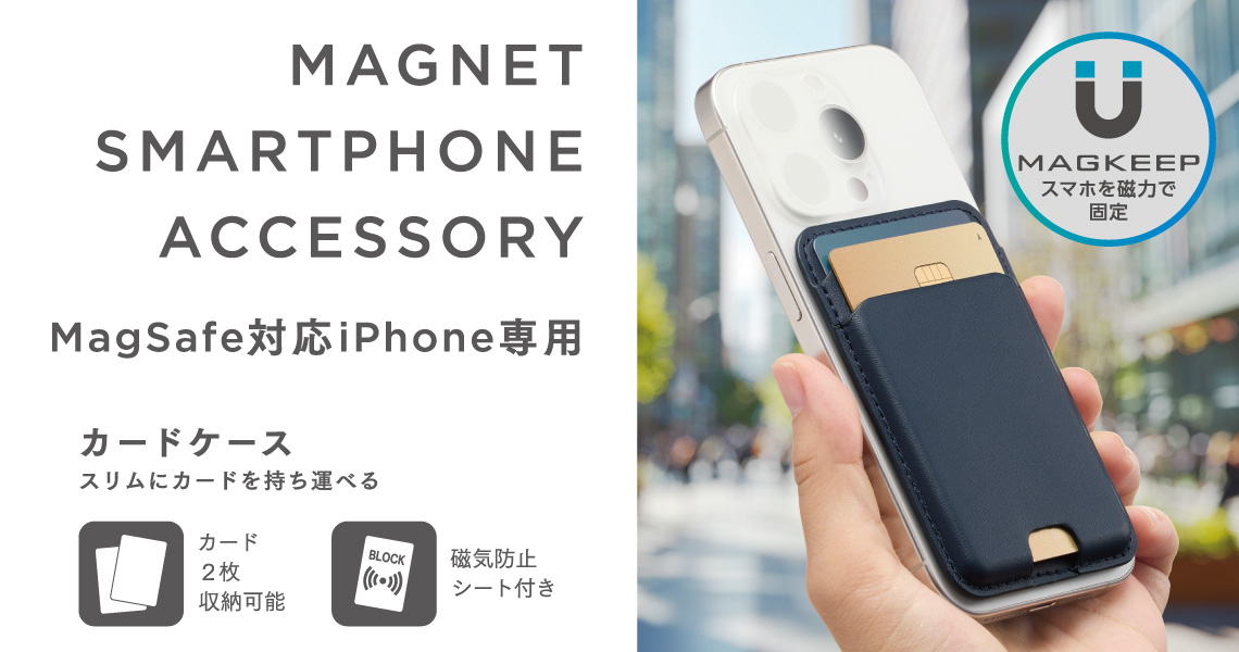 iPhoneに便利をプラス!MagSafeで簡単に着脱できる、MAGKEEPシリーズのカードケースです。スマートフォンとICカードの干渉を防ぐ、磁気防止シートを付属。改札を通るときもスムーズです。