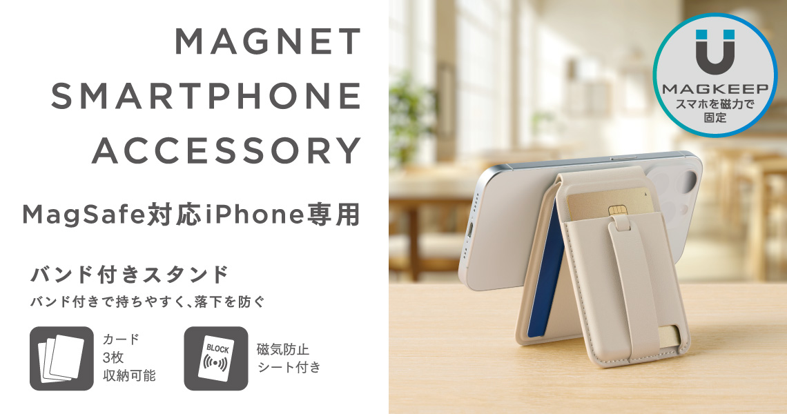 iPhoneに便利をプラス!MagSafeで簡単に着脱できる、MAGKEEPシリーズのカードスタンドです。スマートフォンとICカードの磁気防止シート付きで、改札を通るときもスムーズ。スタンドとしても使え、さまざまなシーンでも快適に動画視聴ができます。指を入れることができるバンド付きで、片手操作や持ち運びに便利です。