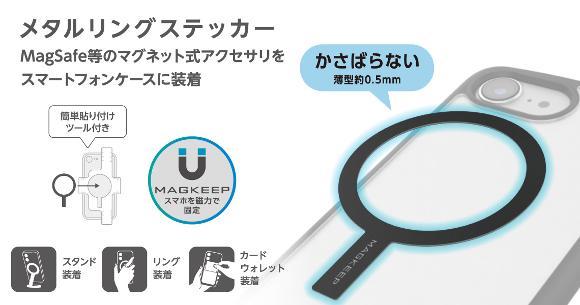 MagSafe非対応のスマホケースに貼り付けることで、MagSafe規格のスマホリングやスタンド、カードケースなどの磁力アクセサリーをしっかり取り付けられます。