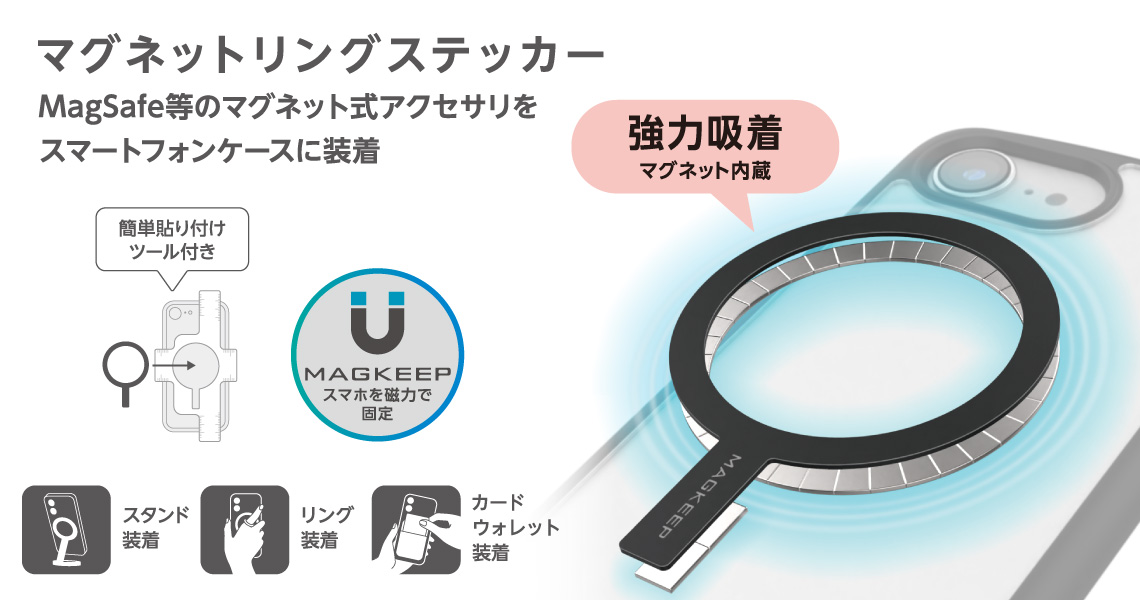ケースに貼るだけで、さまざまなMagSafe対応アクセサリーが使えるようになるマグネットリングステッカーです。
