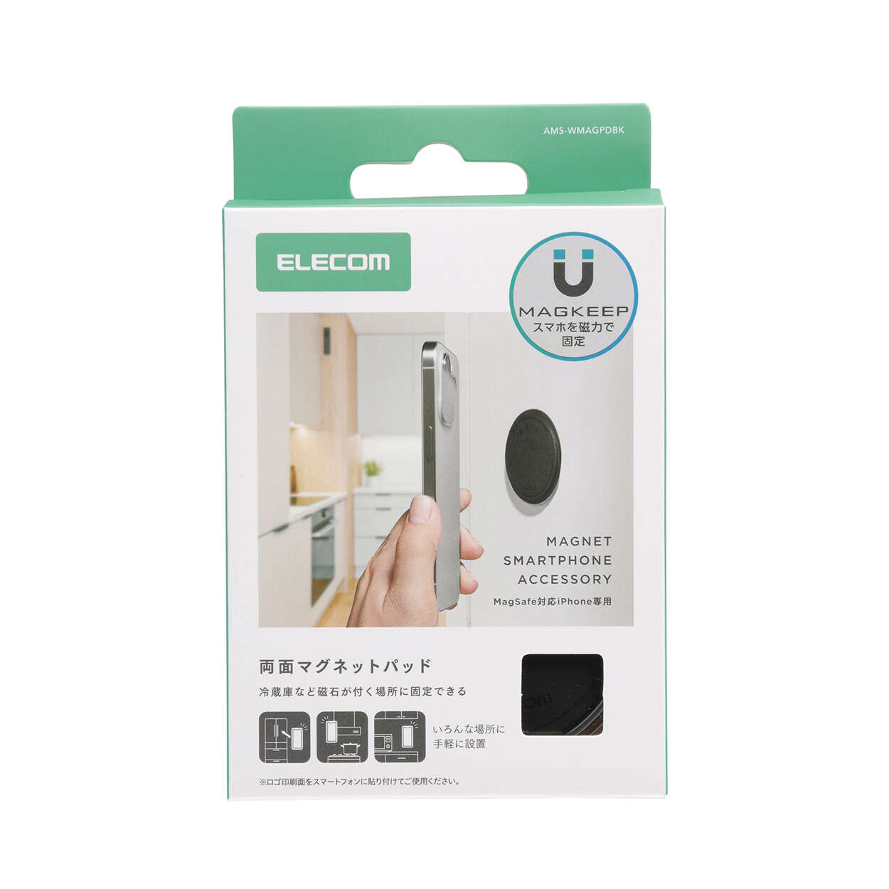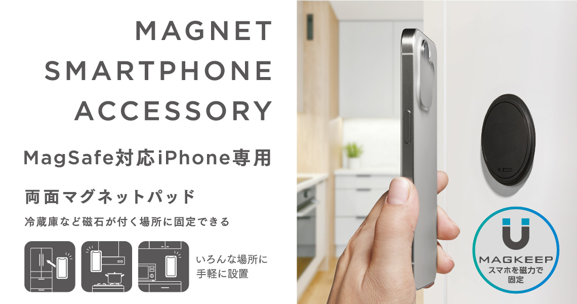 好きな場所にiPhoneを固定!磁石がつく場所に簡単にスマートフォンを固定できる、MAGKEEPシリーズのマグネットパッドです。水に強く、洗面所など水まわりでも使用可能。何度でも貼りなおせて好きな位置に移動でき、手軽に使えます。