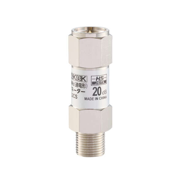 4K8K衛星放送(3224MHz)対応の、テレビ信号を適切な信号レベルに減衰させるアッテネーターです。通電容量:DC15V・0.5A以下またはAC30V・0.5A以下。減衰量:20dB。Wi-Fiや携帯電話など電波の影響を受けにくく与えにくい、高シールド構造の製品です。JEITA HSマーク認証済み。本製品は、自社環境認定基準を1つ以上満たし、『THINK ECOLOGY』マークを表示した製品です 。