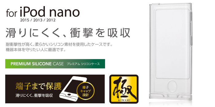 iPod nano2012/2013/2015にぴったりフィットして、ホコリやキズからまもるシリコンケースです。