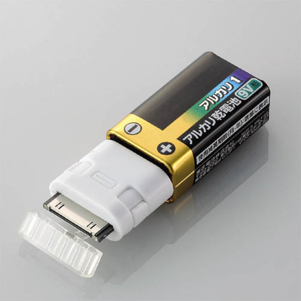 角形9V乾電池1本でdockコネクタ搭載のiPodを充電できます。(3G iPodを除く)