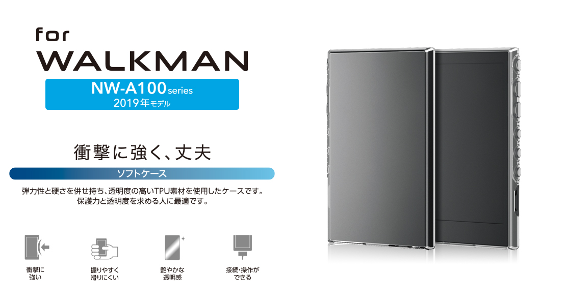 WALKMAN A100シリーズをキズや汚れから守る、強じんでしなやかなTPU(熱可塑性ポリウレタン)素材を使用した薄型ソフトケースです。