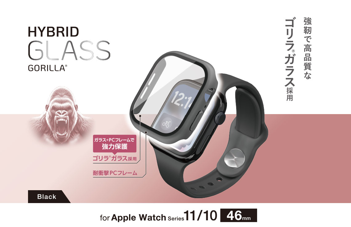 表面硬度10HのGorilla®ガラスと耐衝撃性の高いポリカーボネート素材の2重構造で、Apple Watchの画面および側面部を保護します。