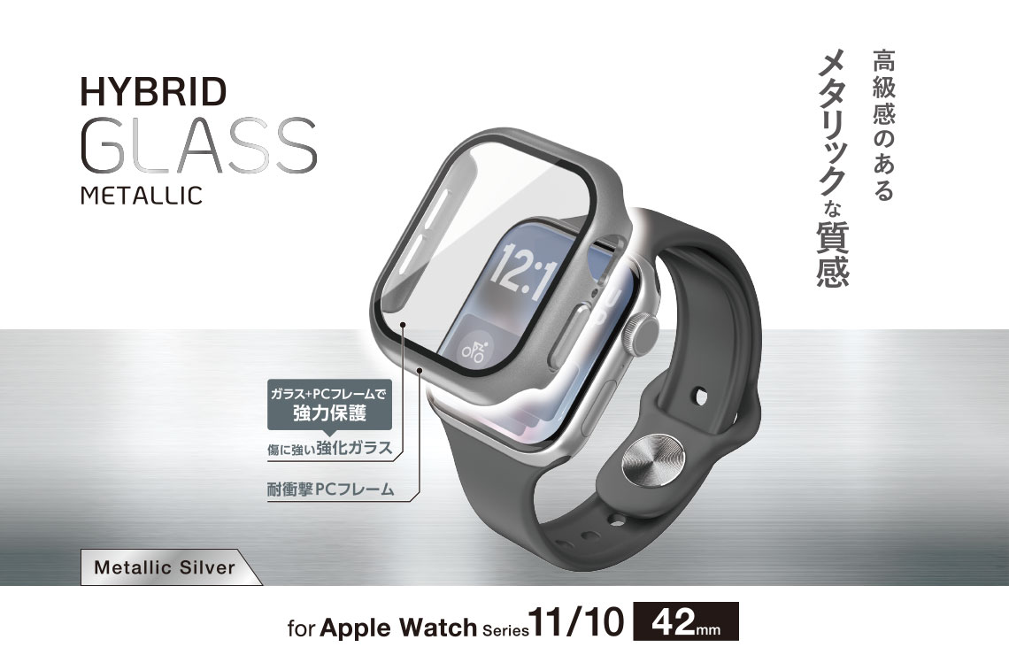 画面の視認性に優れる高透明なガラスとポリカーボネート樹脂で、機器本体を傷や汚れから守る、メタリックデザインが美しく際立つApple Watch用フルカバーケースです。