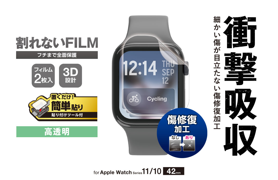 フィルム表面に付いた細かい傷が時間の経過とともに自然と目立たなくなる特殊フィルムを採用した、衝撃吸収、傷リペア、指紋防止タイプのApple Watch用フルカバーフィルムです。貼り付けの際に、ずれやすいフィルムをぴったりと位置合わせできる貼り付けツール付きです。