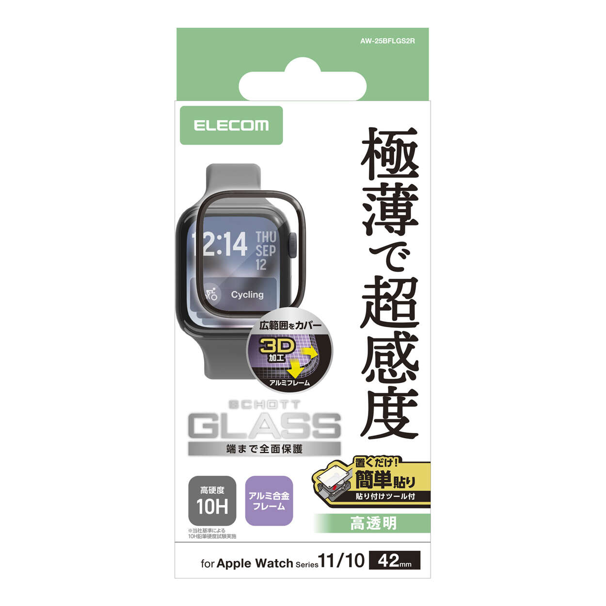 極薄約0.15mmで超感度を実現。SCHOTT社製ガラスを採用し、傷に強い高透明タイプのアルミフレーム付きApple Watch用フルカバーガラスフィルムです。ぴったり位置合わせできる貼り付けツール付きです。