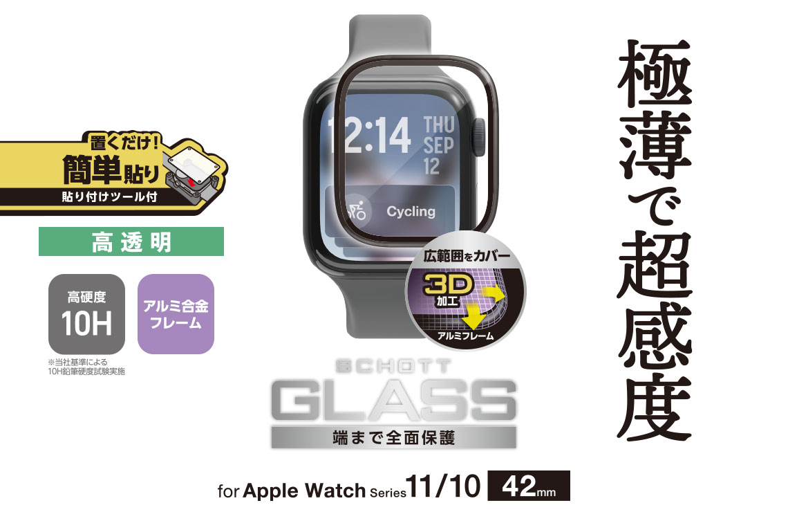 • SCHOTT社製ガラスを採用し、傷に強い高透明タイプのアルミフレーム付きApple Watch用フルカバーガラスフィルムです。