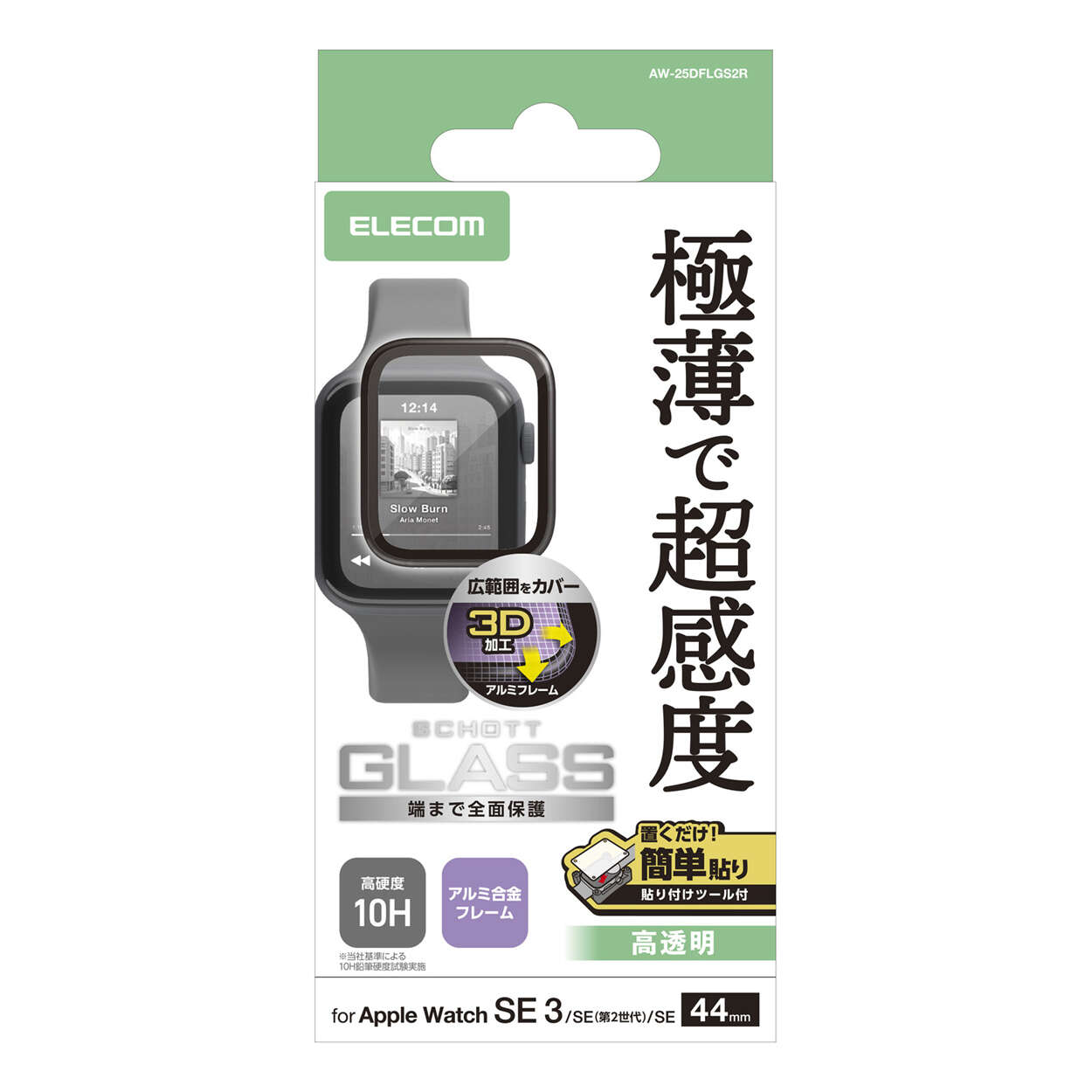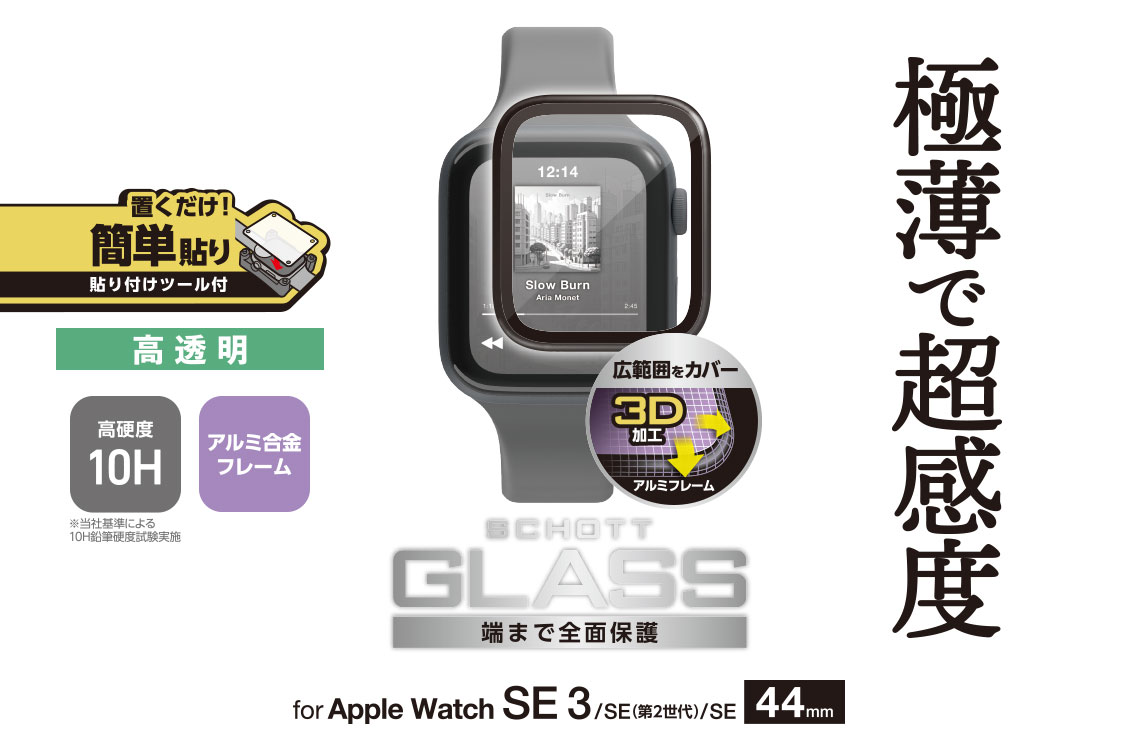 極薄約0.15mmで超感度を実現。SCHOTT社製ガラスを採用し、傷に強い高透明タイプのアルミフレーム付きApple Watch用フルカバーガラスフィルムです。ぴったり位置合わせできる貼り付けツール付きです。