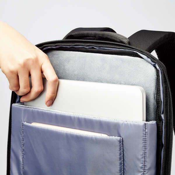 15.6インチのパソコンなどが収納できる内装ポケットには、端末を優しく保護するフリース素材を採用。移動中の揺れによる中の荷物との衝突を防ぎます。