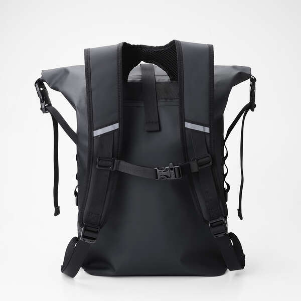 耐水性に優れる樹脂コーティング生地を採用した防水設計ロールトップリュックです。雨などの水滴、手洗いでの水しぶきから荷物を守ります。