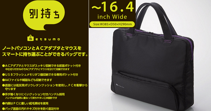 | 16.4インチワイドサイズ以下のパソコンと、ACアダプタがスッキリと収納できるキャリングバッグ“Betsumo(ベツモ)”です。 ノートPCが必要なときだけ、いつも持ち歩いているバッグと一緒に、「別持ち」のサブバッグとして持ち運べる“Betsumo(ベツモ)”は、女性を中心に人気のPCキャリングバッグです。 |