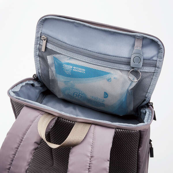 上部収納スペースと下部収納スペースの内側にはメッシュファスナーポケットを配置し、細かい持ち物を収納できます。