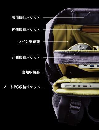 上部のフラップをめくり返すことで、メインルームを快適に開閉可能です。メインルームには、小物収納ポケット、ファスナーポケット、ペンホルダーが付いており、整理して収納可能です。