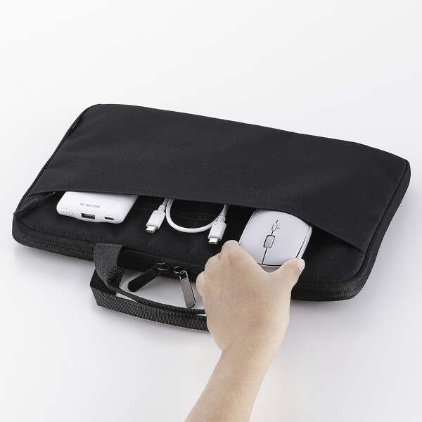 前面にはケーブルや小物をすっきり収納できるファスナーポケット付き。バッグの中がごちゃつかず、必要なものをすぐに取り出せます。