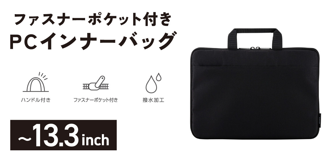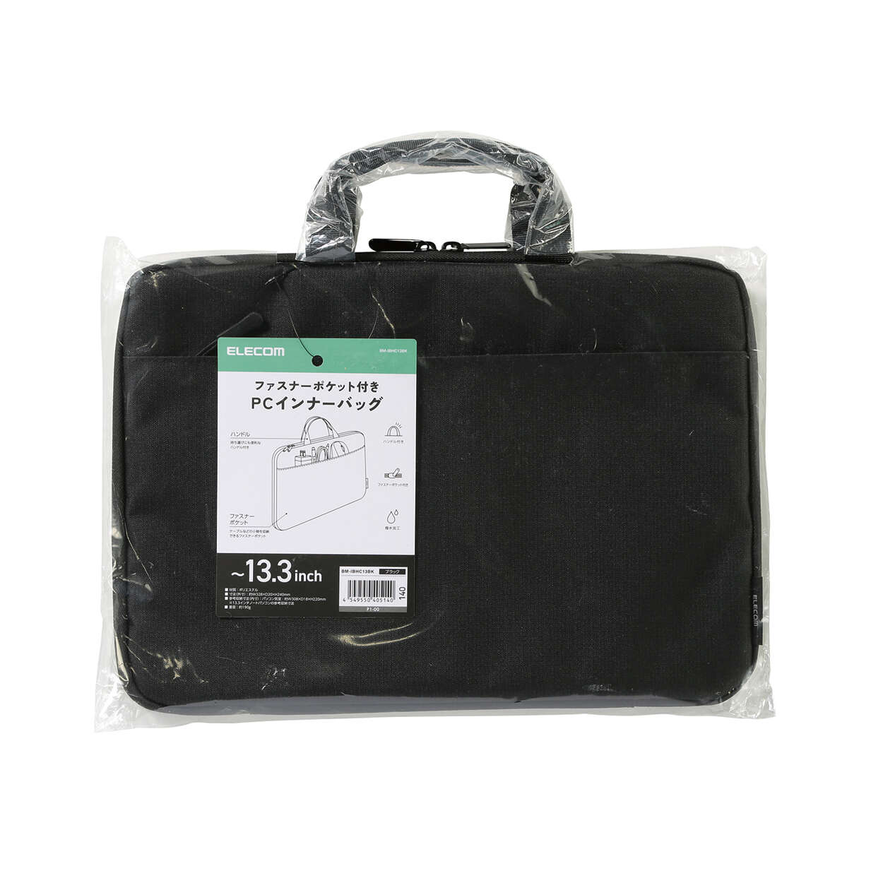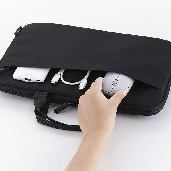 前面にはケーブルや小物をすっきり収納できるファスナーポケット付き。バッグの中がごちゃつかず、必要なものをすぐに取り出せます。