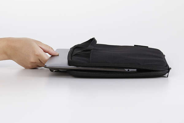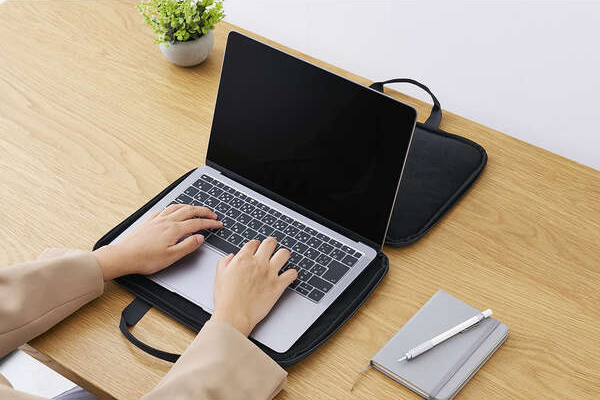 三辺が大きく開くタイプなので、バッグを開いてそのままパソコン操作が可能。出し入れの手間を省けて、作業を効率よく進められます。