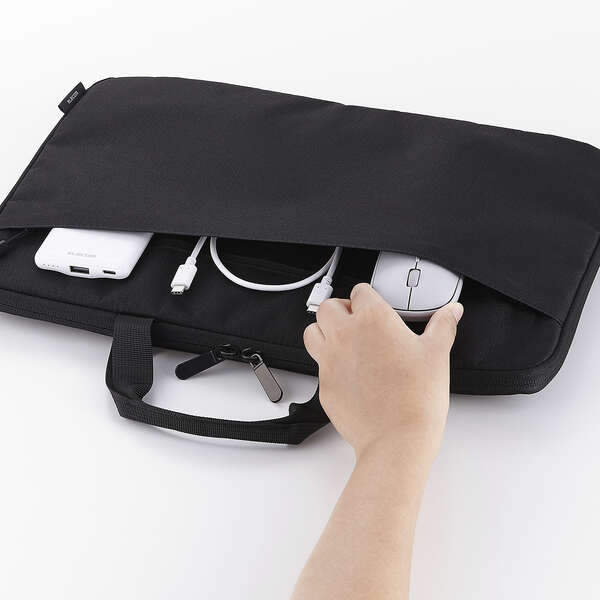 前面にはケーブルや小物をすっきり収納できるファスナーポケット付き。バッグの中がごちゃつかず、必要なものをすぐに取り出せます。