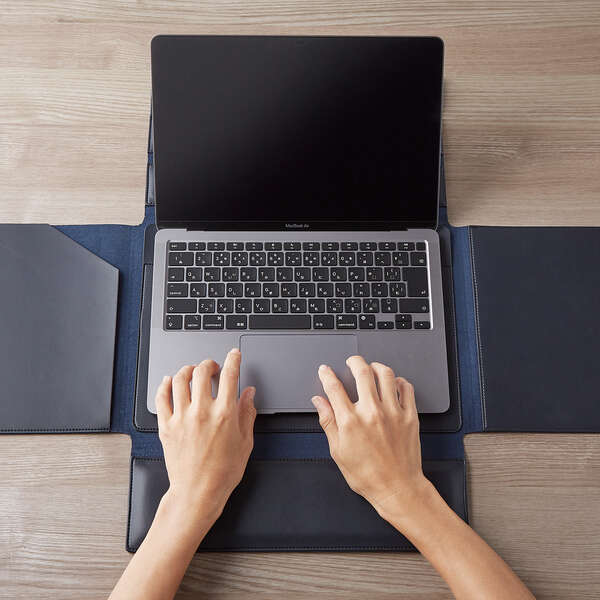 省スペースで仕事環境を整理・展開できる、テレワーク向けマルチインナーケースです。一つの製品にリストレスト、PCスタンド、マウスパッド、スリーブポケットを備え、製品を開くだけで素早く仕事環境が展開できます。