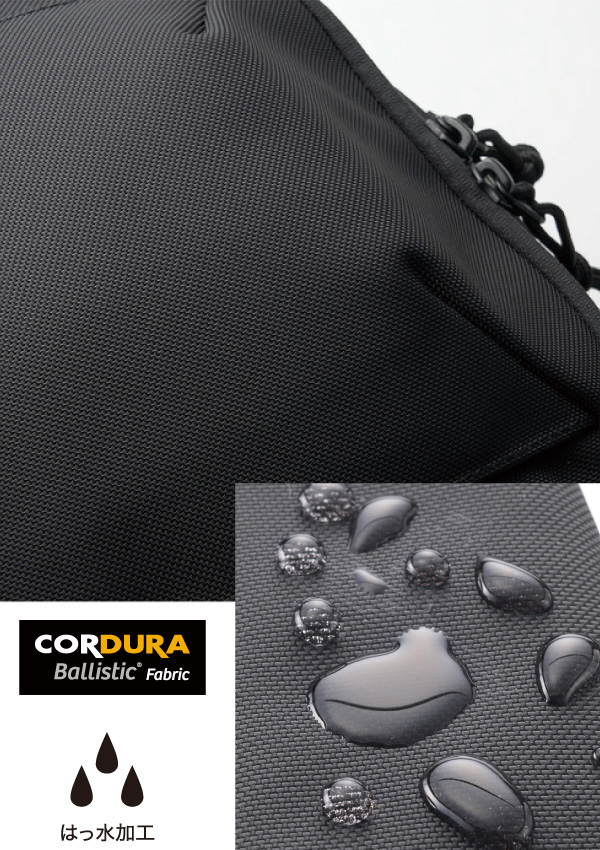 本体外装生地には、引き裂き強度に優れ、高い耐摩耗性と耐久性を備えたCORDURA Ballisticファブリックを採用しています。