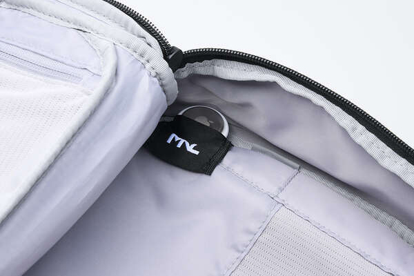 メイン気室内部のネームタグはAirTagを入れることができるポケット仕様になっています。バッグ本体の紛失防止に役立ちます。