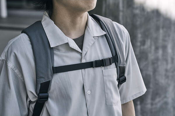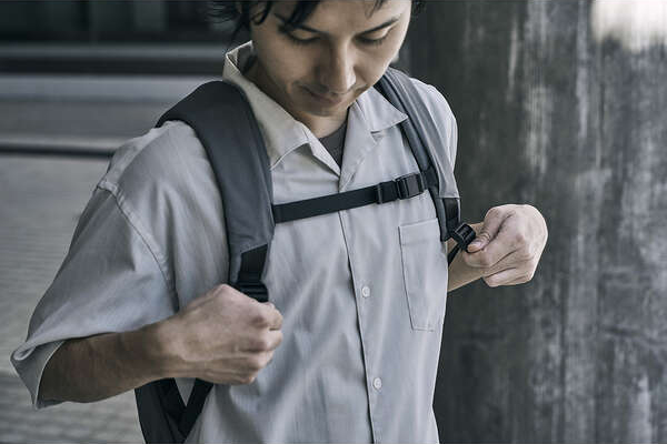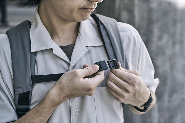 チェストベルトでしっかり荷物を体に添わせ、背負い心地を調整できます。マグネットバックルを採用しており、片手で簡単に着脱可能です。不要な場合はチェストベルト自体を取り外すこともできます。