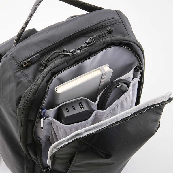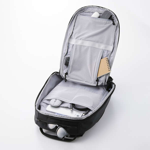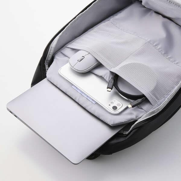 メイン気室には、前面側に上下2つのメッシュポケット、背面側にはタブレット用とパソコン用それぞれのオープンポケットと、2つのオープンポケットを配置。マウスやAC充電器なども分けて収納できるため、必要なものをサッと取り出せてスムーズに仕事を始められます。