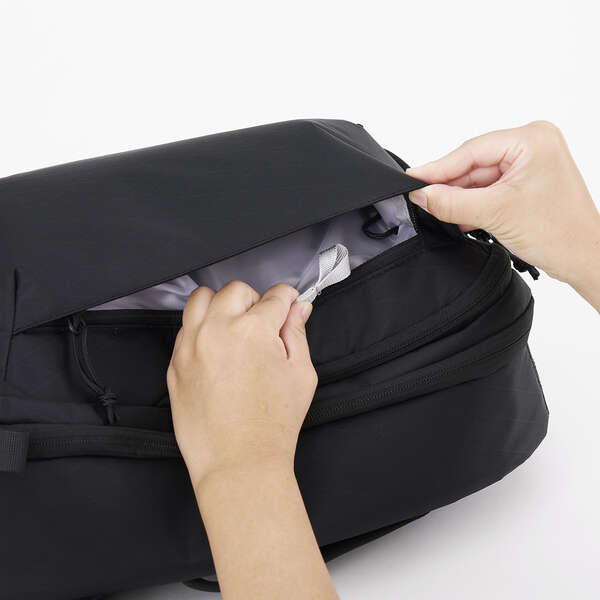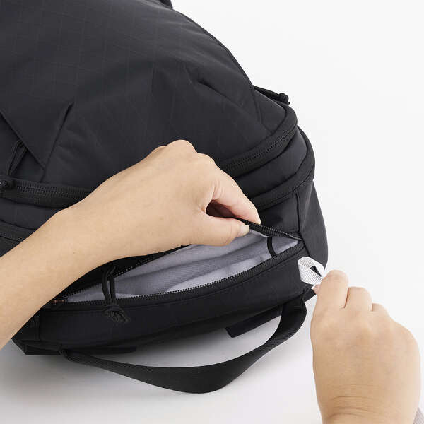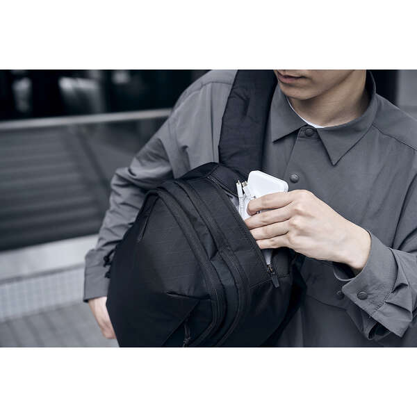 最上部のファスナーポケットは、混雑時の狭い場所でも荷物を楽に取り出せます。イヤホンなど使用頻度の高い小物の収納に便利です。