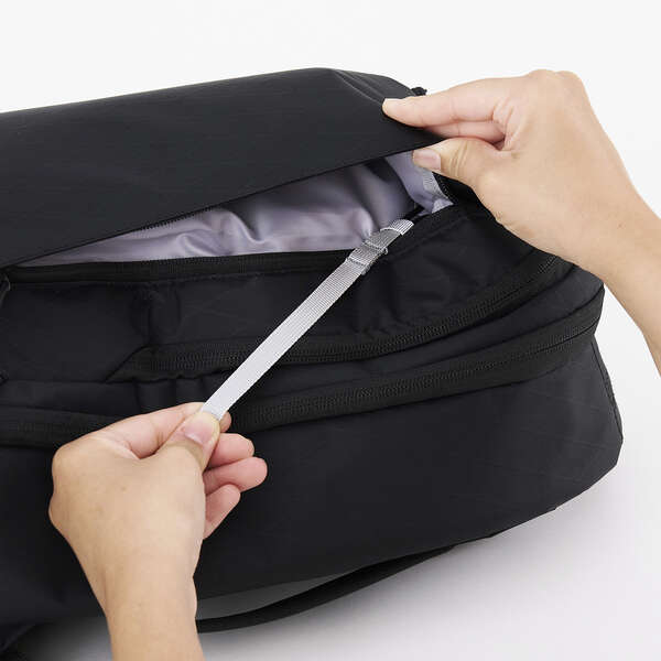 最上部ポケットのファスナーは、引き手を横に向けるとロックがかかる仕組みになっています。移動中に不意に開いてしまう心配もありません。