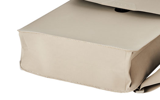 フラップ部分にはボタン型マグネットホックを採用し、ワンタッチで接着します。特殊構造により下向きに引っ張らないとロック解除されない設計になっているので、誤動作によって不意にフラップが開かないようになっています。