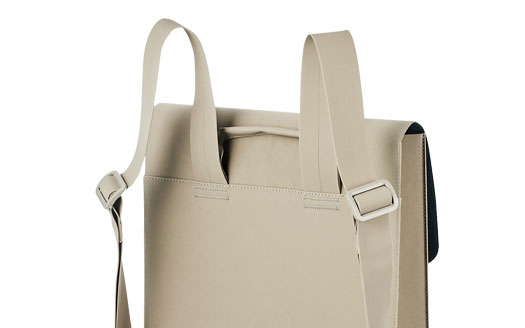 ショルダーベルトとハンドルは、薄い本体に馴染みつつ身体に軽やかにフィットするテープ状に設計しています。