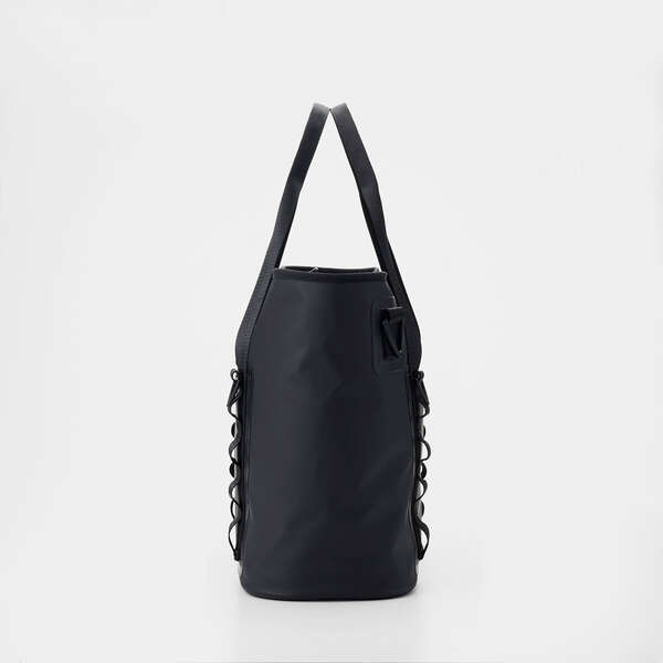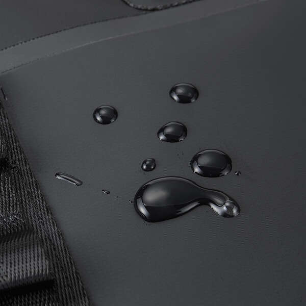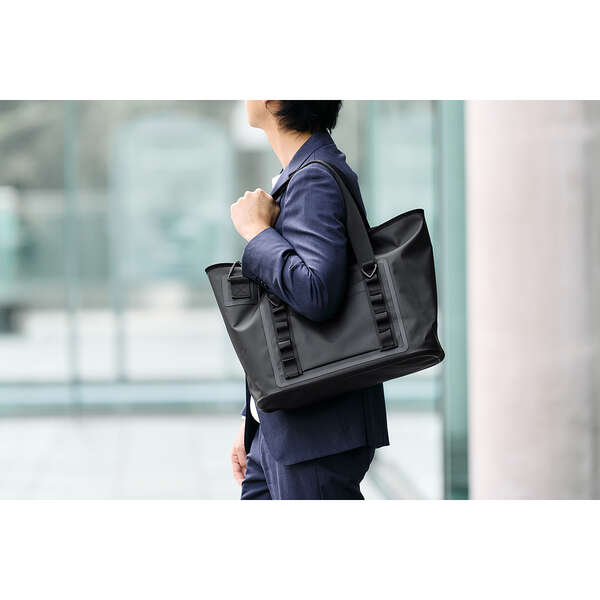 耐水性に優れる樹脂コーティング生地を採用した防水設計トートバッグです。雨などの水滴、手洗いでの水しぶきから荷物を守ります。