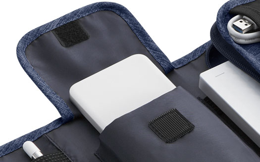 ポーチ内部にケーブルを挿したままモバイルバッテリーやスマートフォンを収納可能なフラップ開閉ポケットがついています。