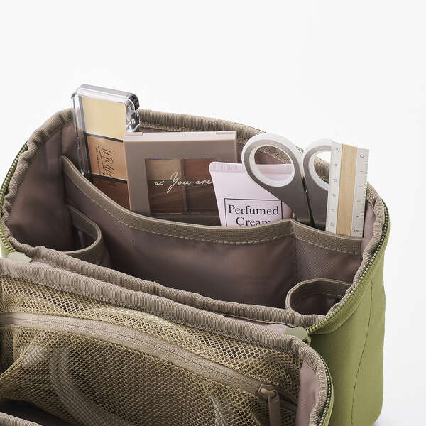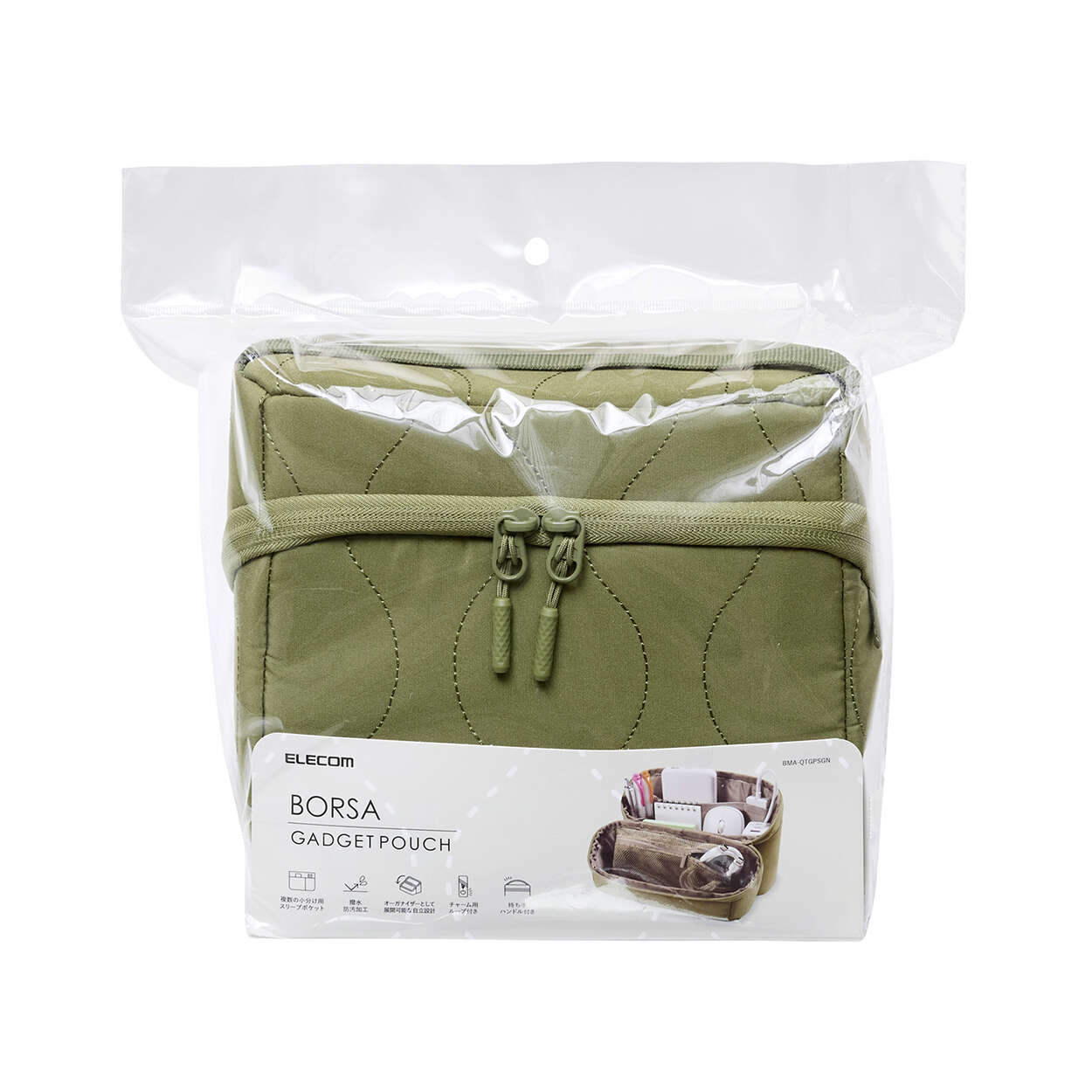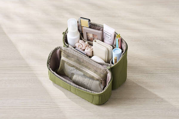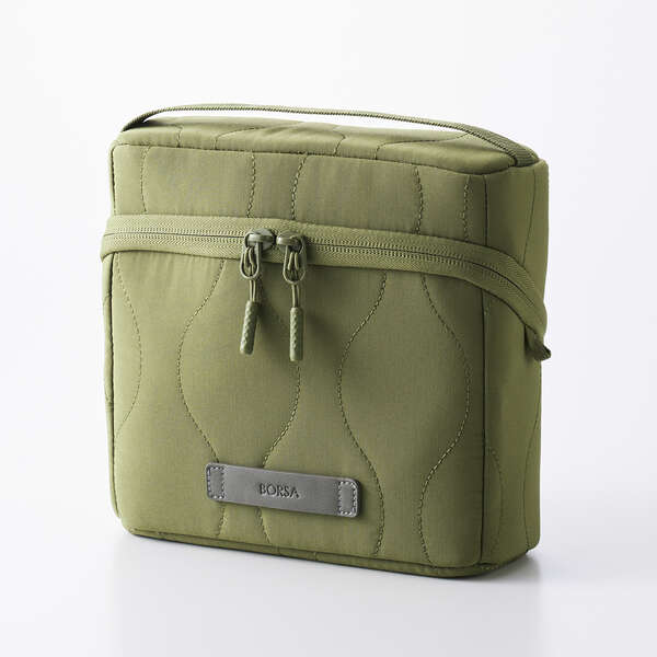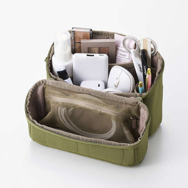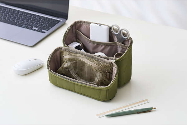 デスク周りの小物やガジェット、筆記用具などのワークツールをまとめてスッキリ収納!たっぷり入る大容量タイプで、デスク上で道具入れとして使える、スタンドタイプのツールポーチです。持ち運びに便利なハンドル付き。上品な光沢のあるオニオンステッチのキルティング素材を採用した、大人カジュアルなデザインです。