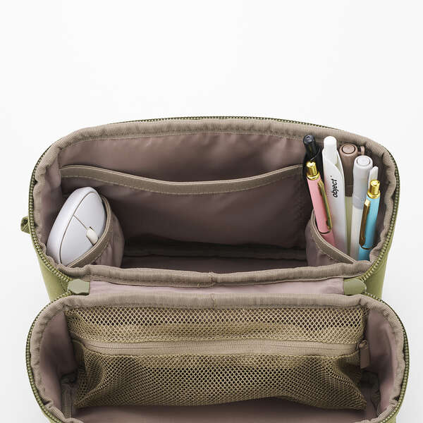 ペンやケーブルをまとめて収納できるファスナー開閉式のメッシュポケットを備えています。
