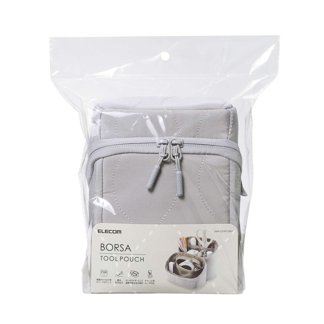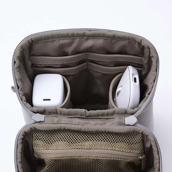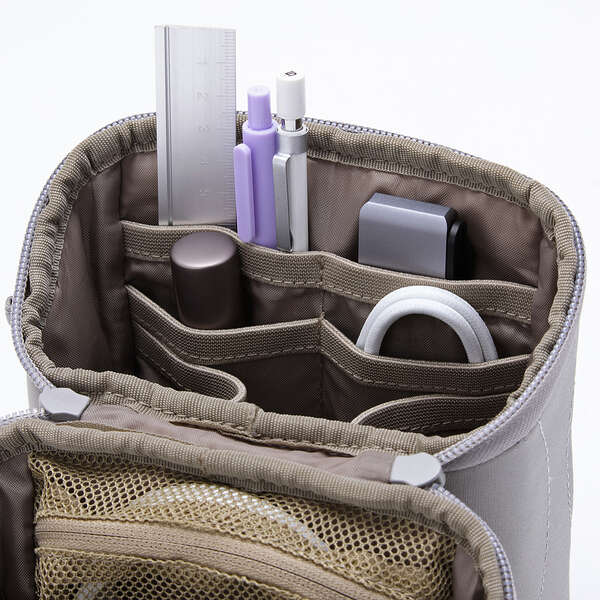 ペンやケーブルをまとめて収納できるファスナー開閉式のメッシュポケットを備えています。