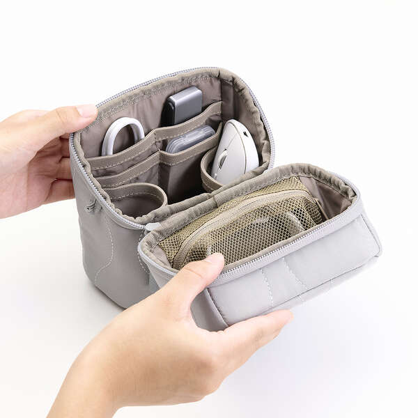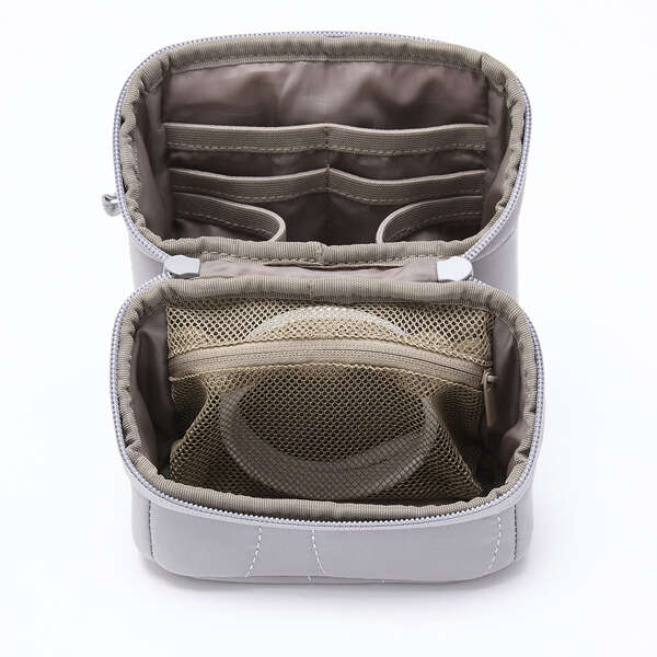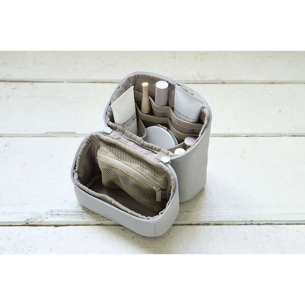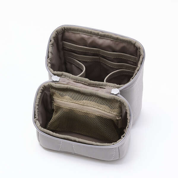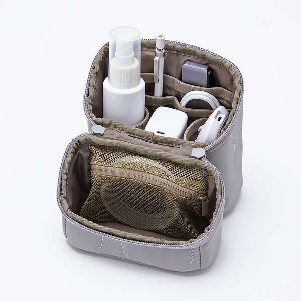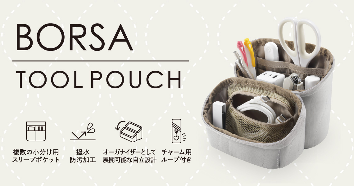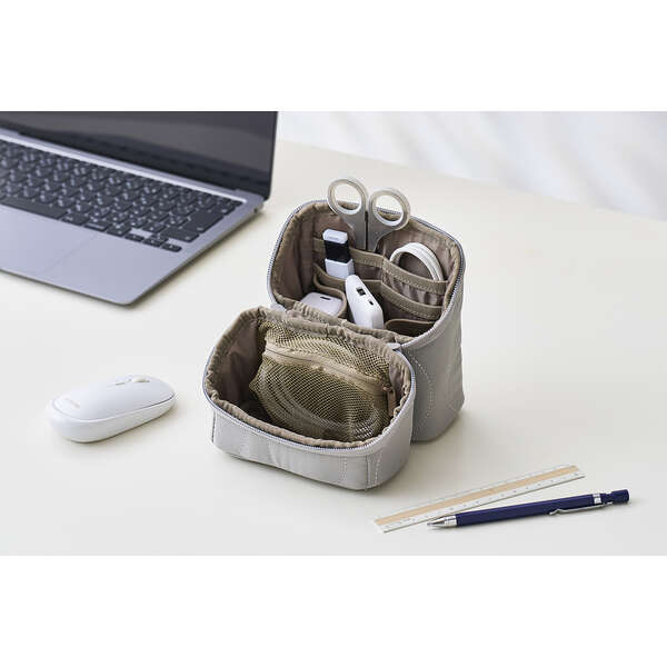 デスク周りの小物やガジェット、筆記用具などのワークツールをまとめてスッキリ収納!デスク上で道具入れとして使える、スタンドタイプのツールポーチです。上品な光沢のあるオニオンステッチのキルティング素材を採用した、大人カジュアルなデザインです。