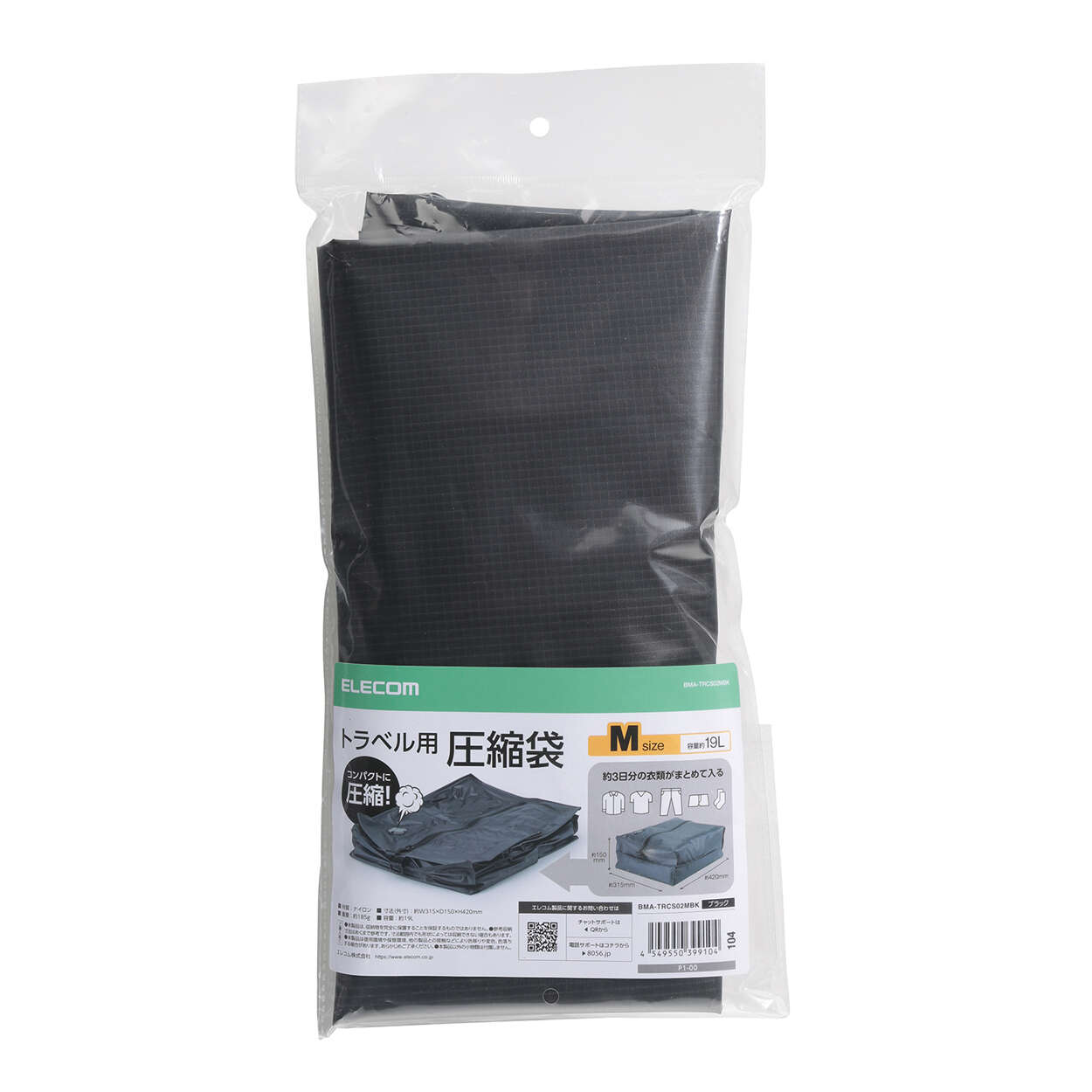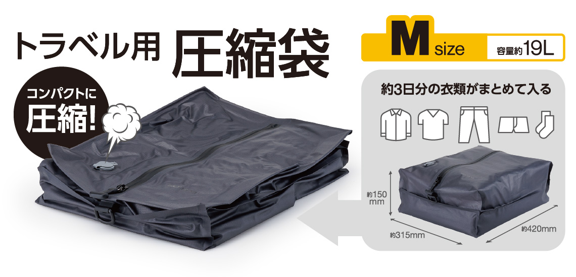 袋内の空気を抜くことで衣類を圧縮し、コンパクトに収納可能。荷物がすっきりまとまるので、カバンの容量に余裕が生まれます。