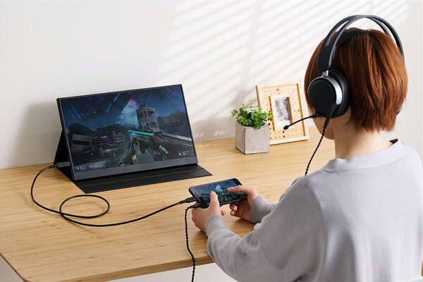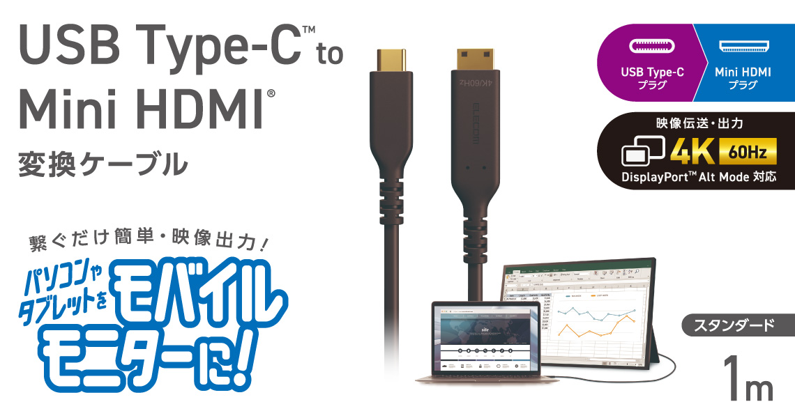 USB Type-C(TM)ポート搭載のパソコンなどから、Mini HDMI(R)ポート搭載のモバイルモニターなどに映像を出力できる変換ケーブルです。画面複製と画面拡張に対応しています。