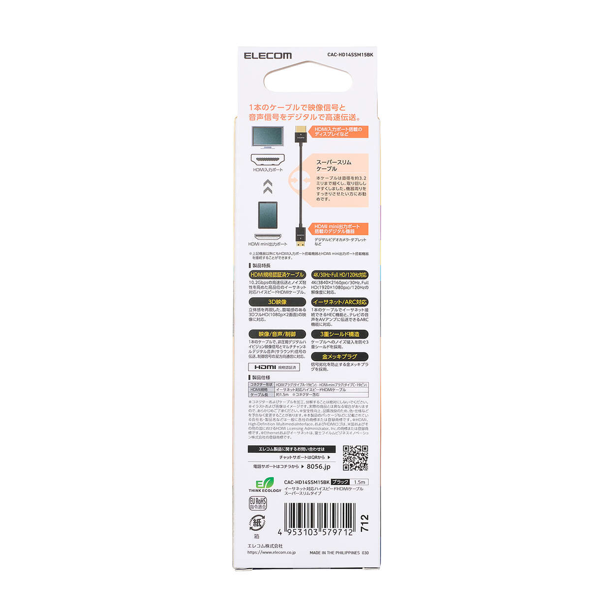 | ケーブル直径約3.2mmで取り回しがしやすく、すっきり配線できる、スーパースリムタイプのイーサネット対応ハイスピードHDMIケーブルです。HIGH SPEED with Ethernet認証済み製品です。 |