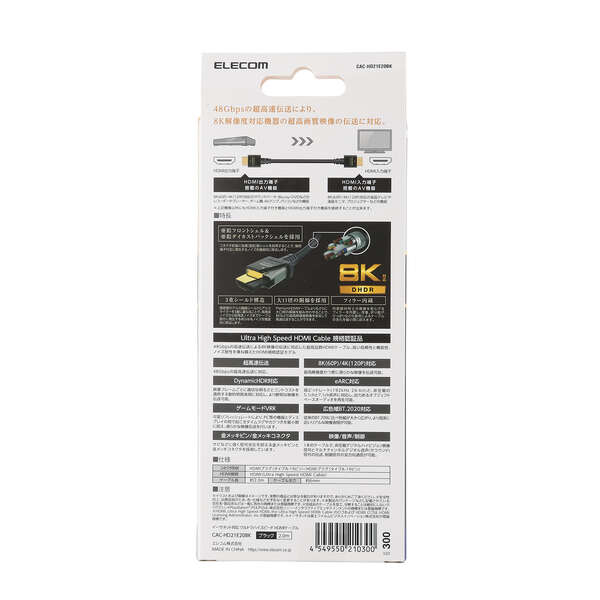 48Gbpsの高速伝送により8K(60p)/4K(120p)に対応しています。高い信頼性と機能性、ノイズ耐性を兼ね備えたウルトラハイスピードHDMI(R)ケーブルです。