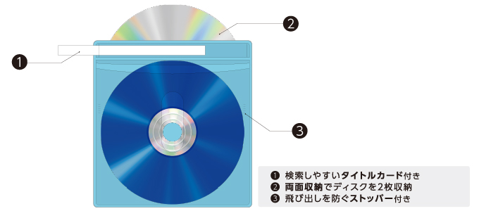 ケース1枚あたりにディスク2枚、またはディスク1枚とジャケットが収納できる両面収納タイプです。
