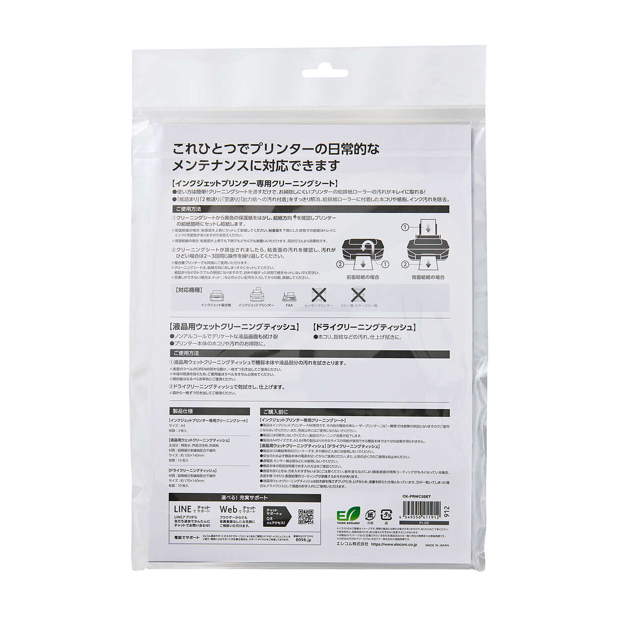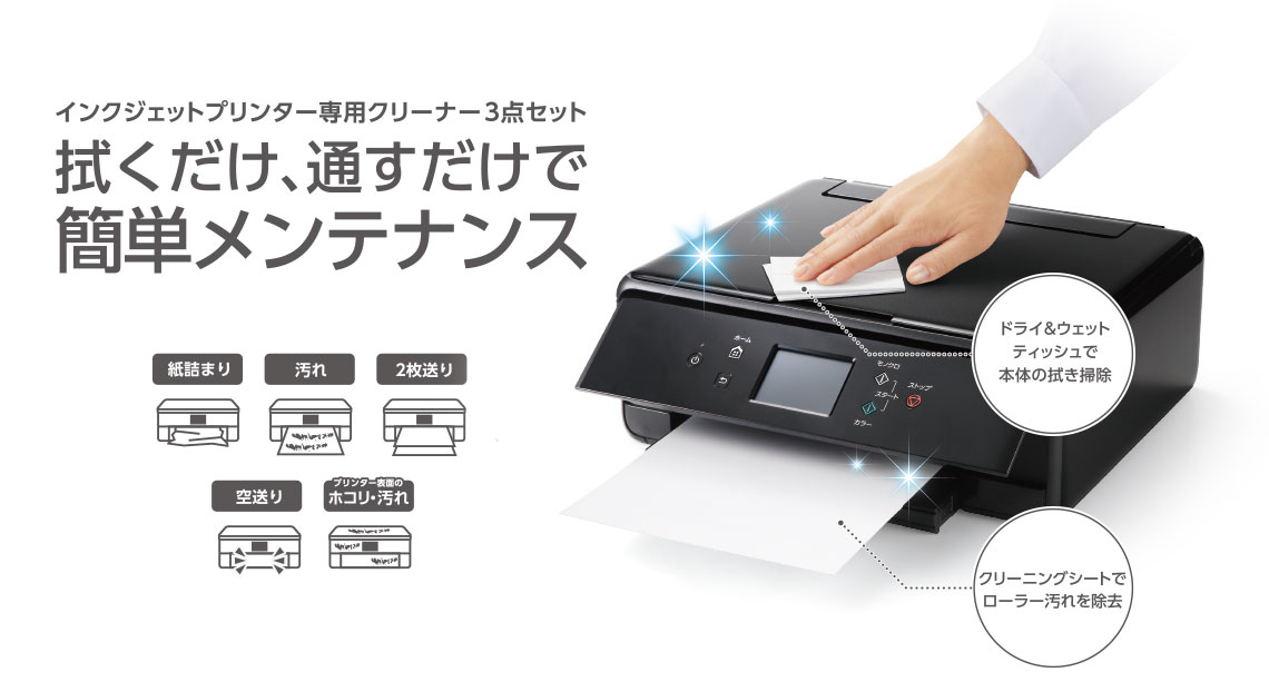 これひとつでプリンターの日常的なメンテナンスが可能。掃除しにくいプリンターの給排紙ローラーの汚れが取れるインクジェットプリンター専用クリーニングシート、機器本体や画面部分の汚れを拭き取ることができる液晶用ウェットクリーニングティッシュとドライクリーニングティッシュの3点が入った、プリンタークリーニングセットです。