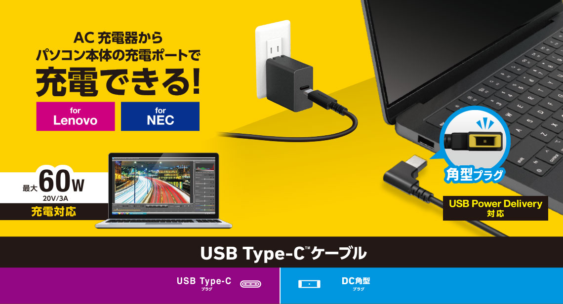 Lenovo/NECのノートパソコンで使える充電ケーブルです。最大20V/3Aの60W USB Power Delivery充電に対応しています。対応AC充電器に接続することで、ノートパソコンに充電ができます。