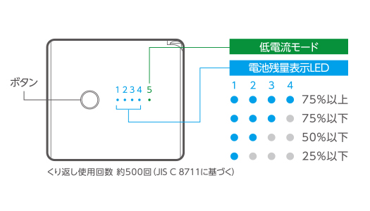 電池残量は4段階のLEDランプ点灯で確認可能です。