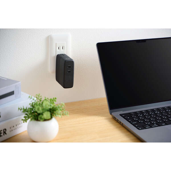 AC充電器として1ポート接続時67W、2ポート同時接続時65Wの出力が可能。スマートフォンとノートパソコンを同時に充電できます。パソコンで作業をしている間にスマートフォンの充電を済ませられるから、出張時・外出時にぴったりです。