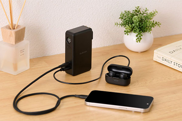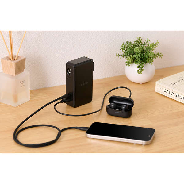 USB Type-C™ポート×1、USB-Aポート×1を搭載。スマートフォンとワイヤレスイヤホンなど、複数のデバイスを接続して一気に充電できます。